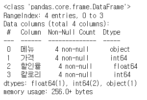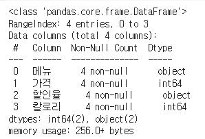 # 데이터 프레임 만들기 (할인율과 칼로리 : 문자열)