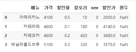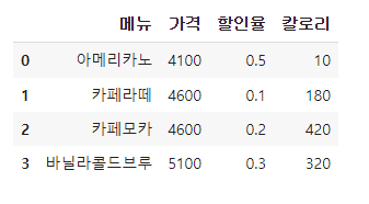 df = df.drop(1, axis=0) # 인덱스 1인 카페라떼 삭제