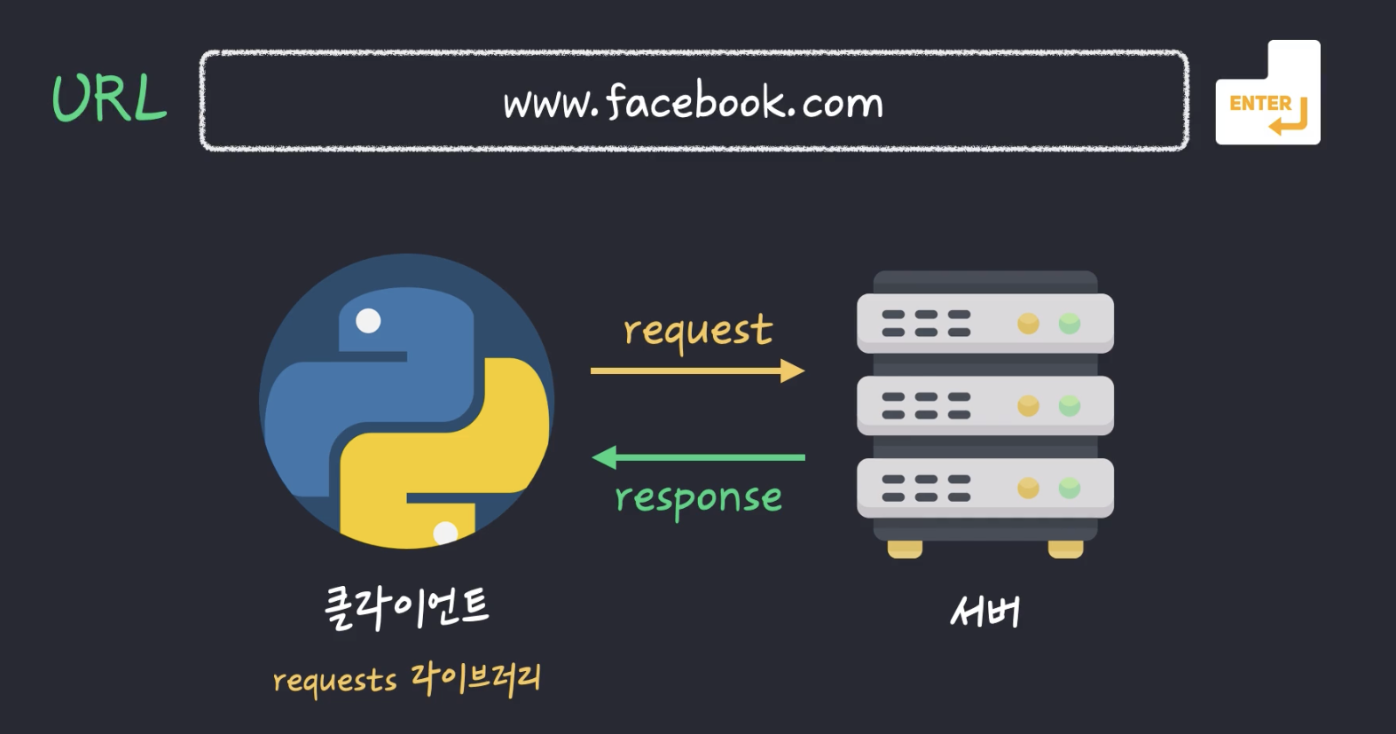 - 크롬 주소창에 www.facebook.com을 치면(requests를 보내면) 서버는 페이스북이, 클라이언트는 브라우저인 크롬이 되는것.