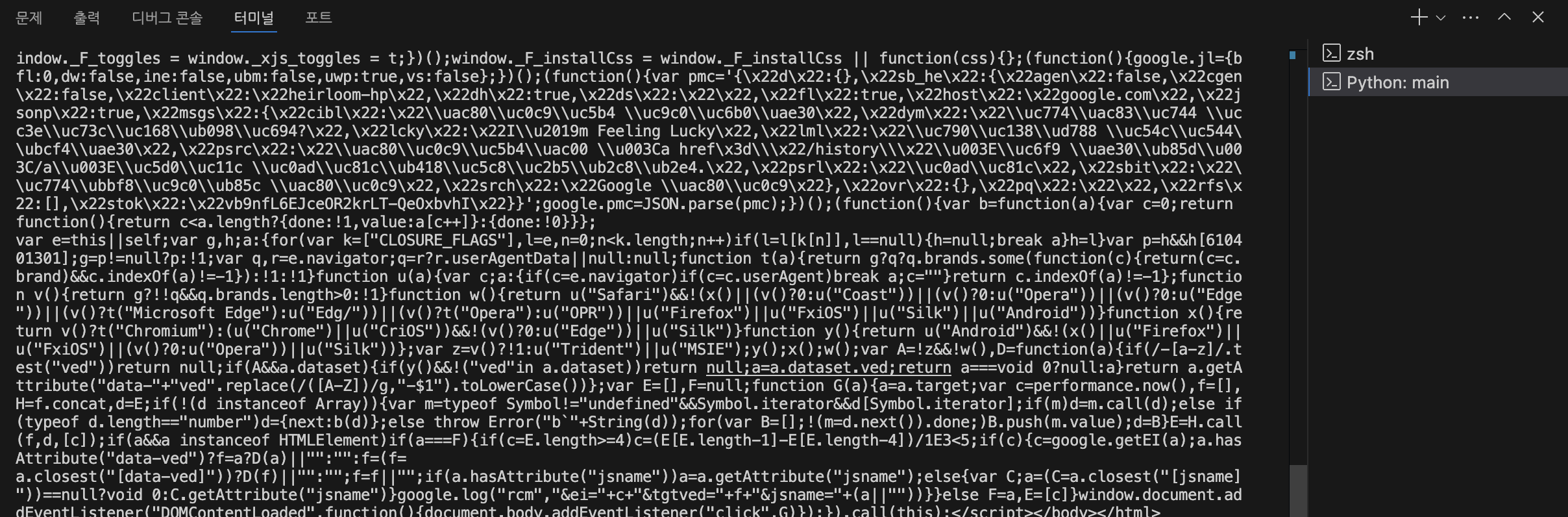 - 출력 결과를 확인해보면 아래와 같이 구글사이트의 html 코드를 확인할 수 있고, 자세히 보면 html 태그들이 보임