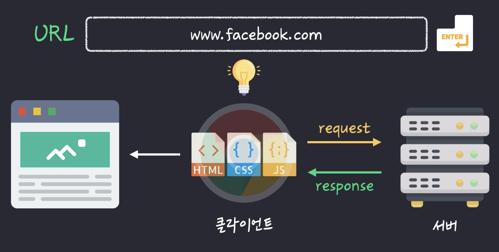 - 즉, 페이스북 서버가 요청에 따라 크롬 클라이언트에 html 코드와 js, css 코드를 보내줌