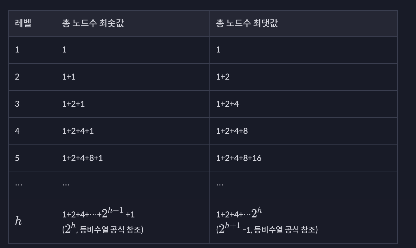 높이가 하나 더 증가할 때 : 노드수가 현재보다 최소 2배 이상이 되었을 때