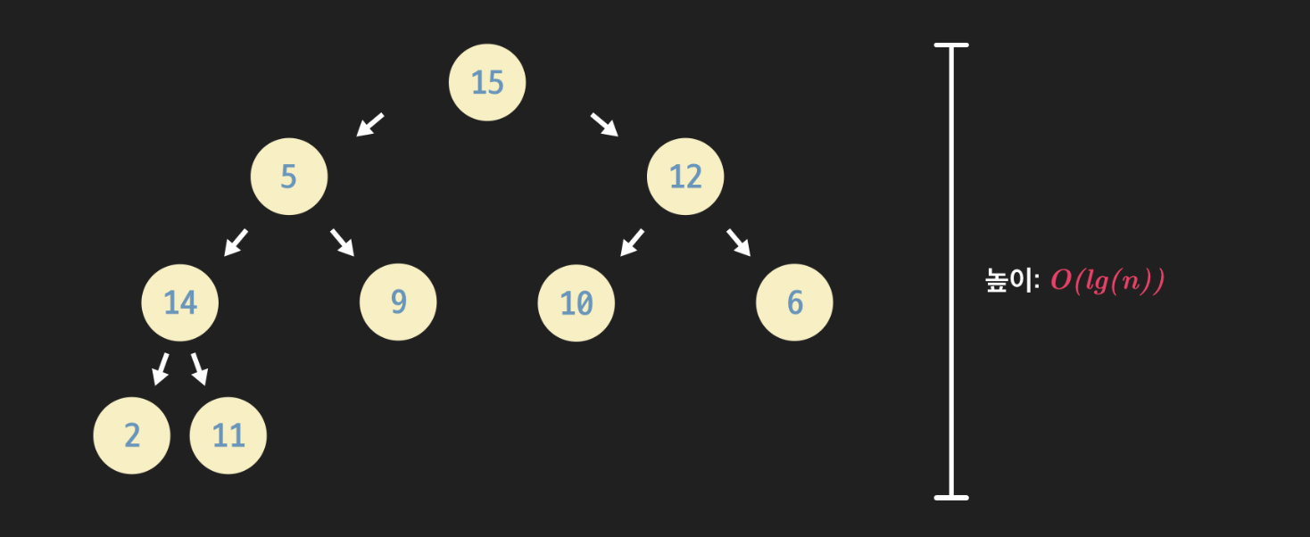 - 완전 이진 트리 안에 저장된 노드가 n개라고 할 때, 높이는 항상 lg(n)에 비례한다.