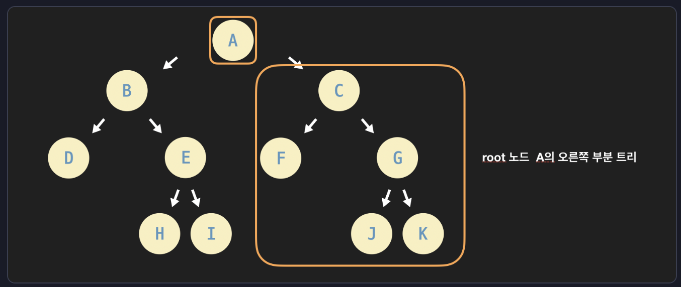 → C가 root 노드인 트리에서 C는 A의 오른쪽 자식이고, 그래서 노란색 큰 박스 안에 있는 부분 트리를 A의 “오른쪽 부분 트리”라고 한다.