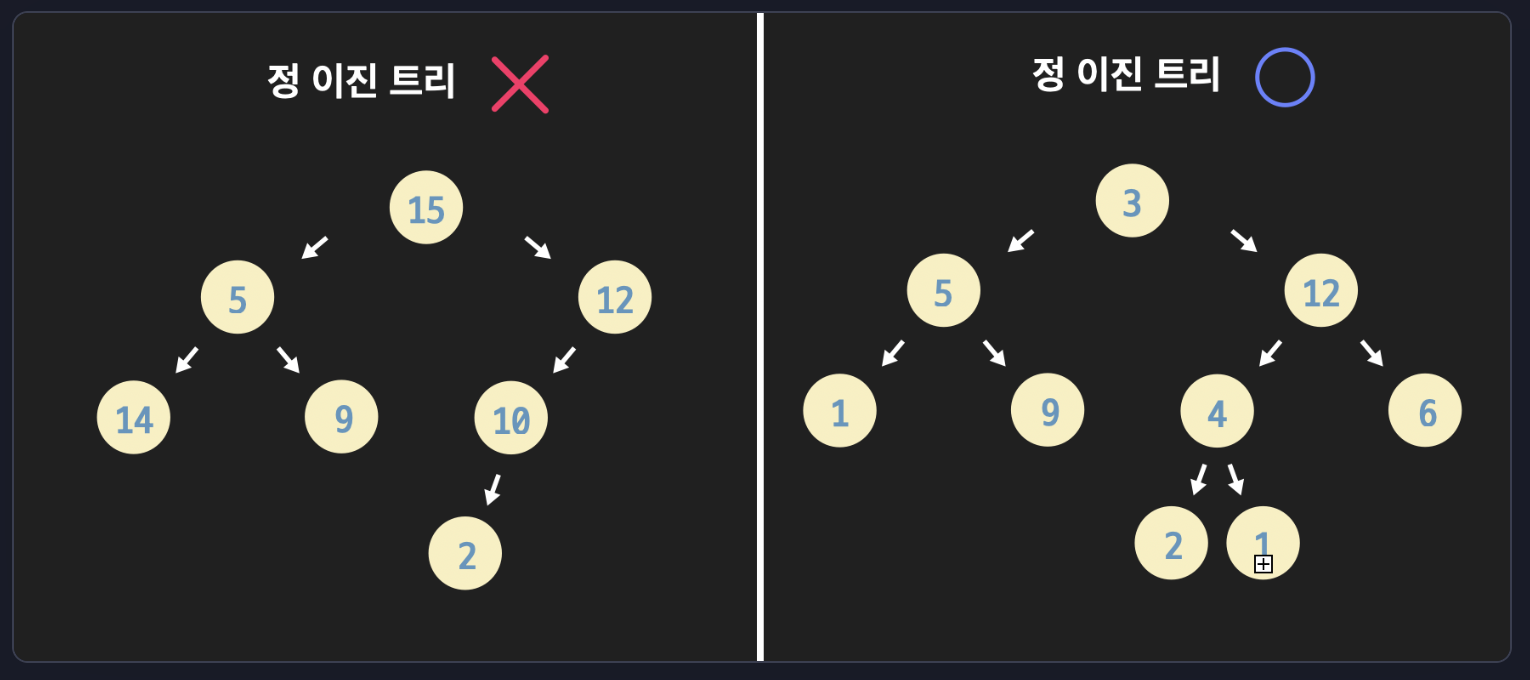 - 모든 노드가 2개 또는 0개의 자식을 갖는 이진 트리