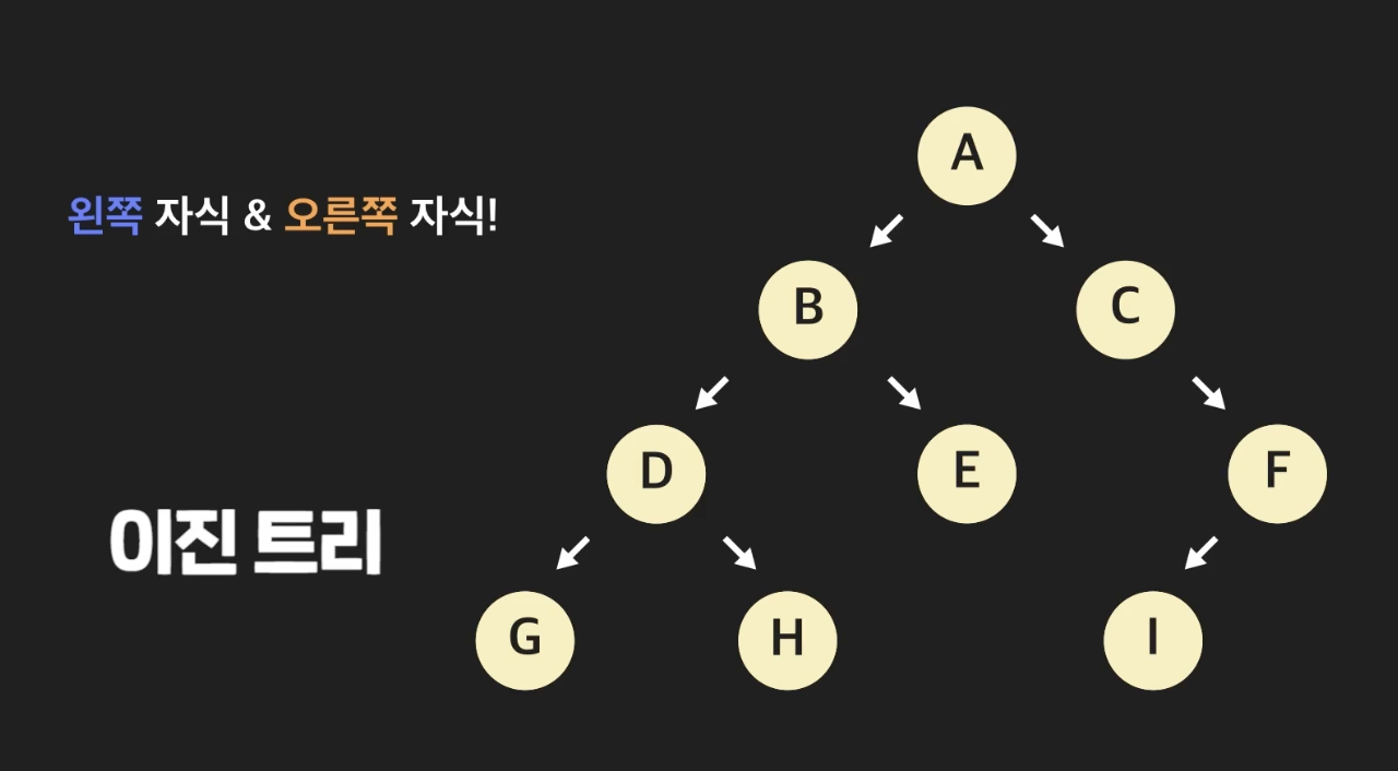 - 이진 트리 : 각 노드가 최대 2개의 자식 노드를 가질 수 있는 트리