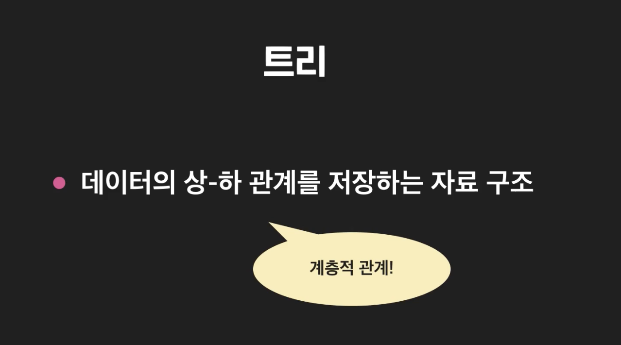 - 강의 url : https://www.codeit.kr/topics/trees?mediumTypedId=UGxheWxpc3Q6NjZkZDU5YWI4OTg1YTI3ZWRkOTdlOWUz