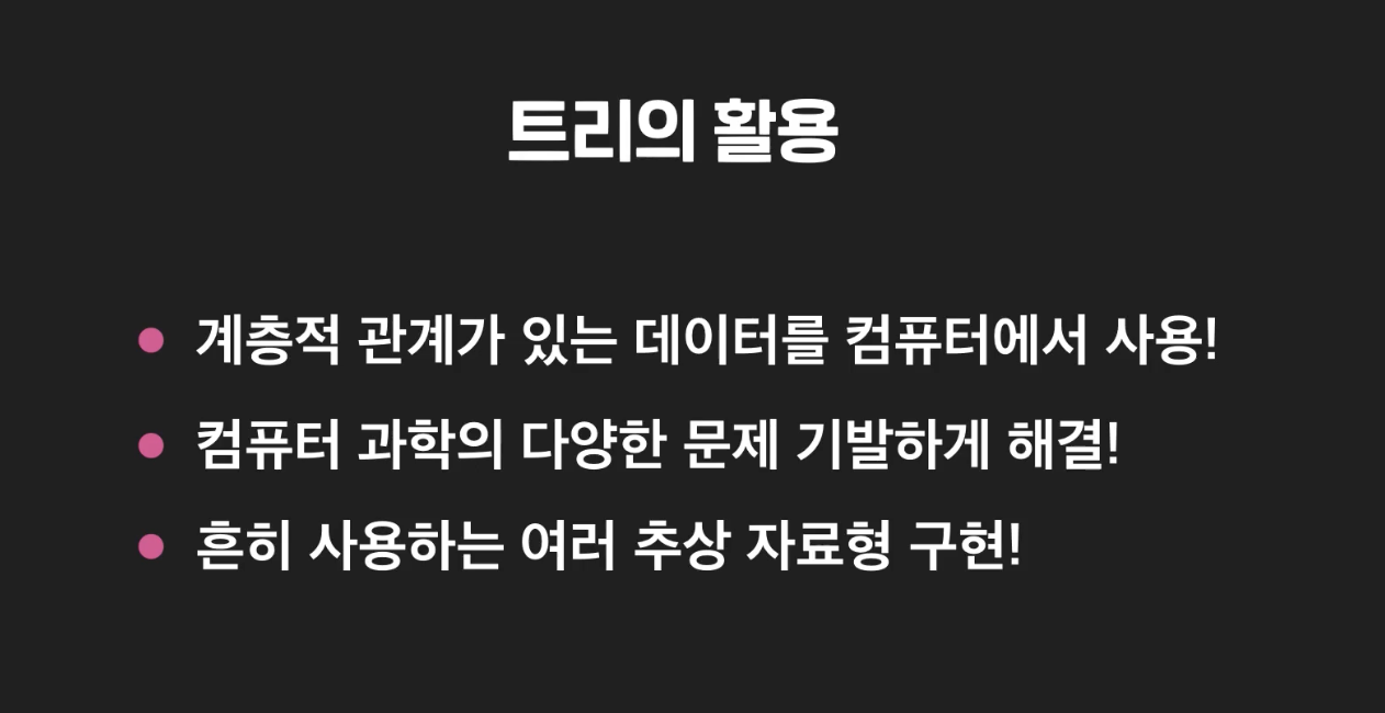 - 트리구조를 잘 활용하여 딕셔너리, 세트, 우선순위 큐 등의 추상자료형들을 구현할 수 있음