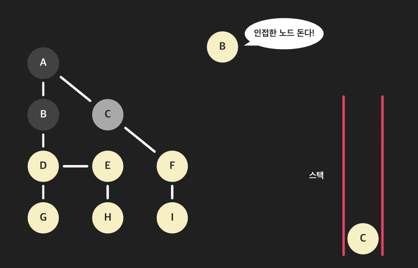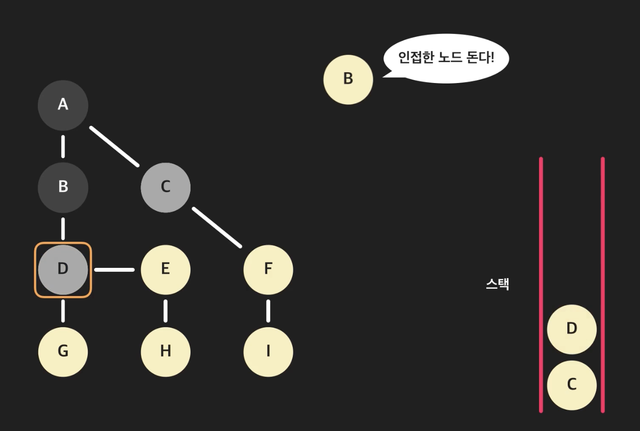 - A는 건너뛰며, D는 처음 보는 노드이므로 표시 후 스택에 넣어줌. B와 인접한 노드들은 모두 처리함
