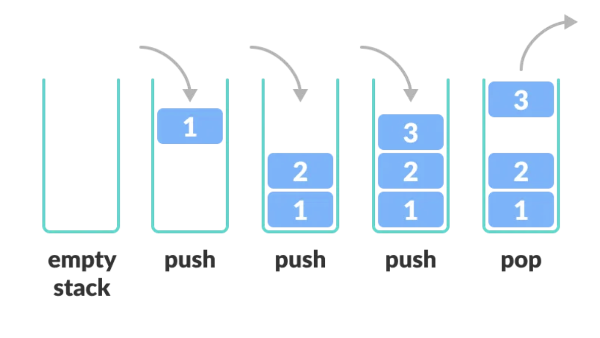 - 가장 마지막에 들어간 데이터가 가장 먼저 나오기 때문에 이런 행동을 LIFO, Last-in-first-out이라고 부르기도 함