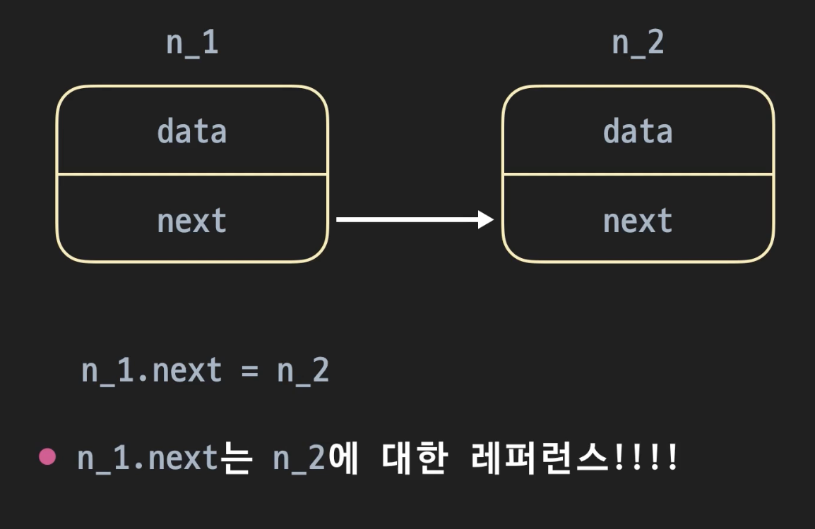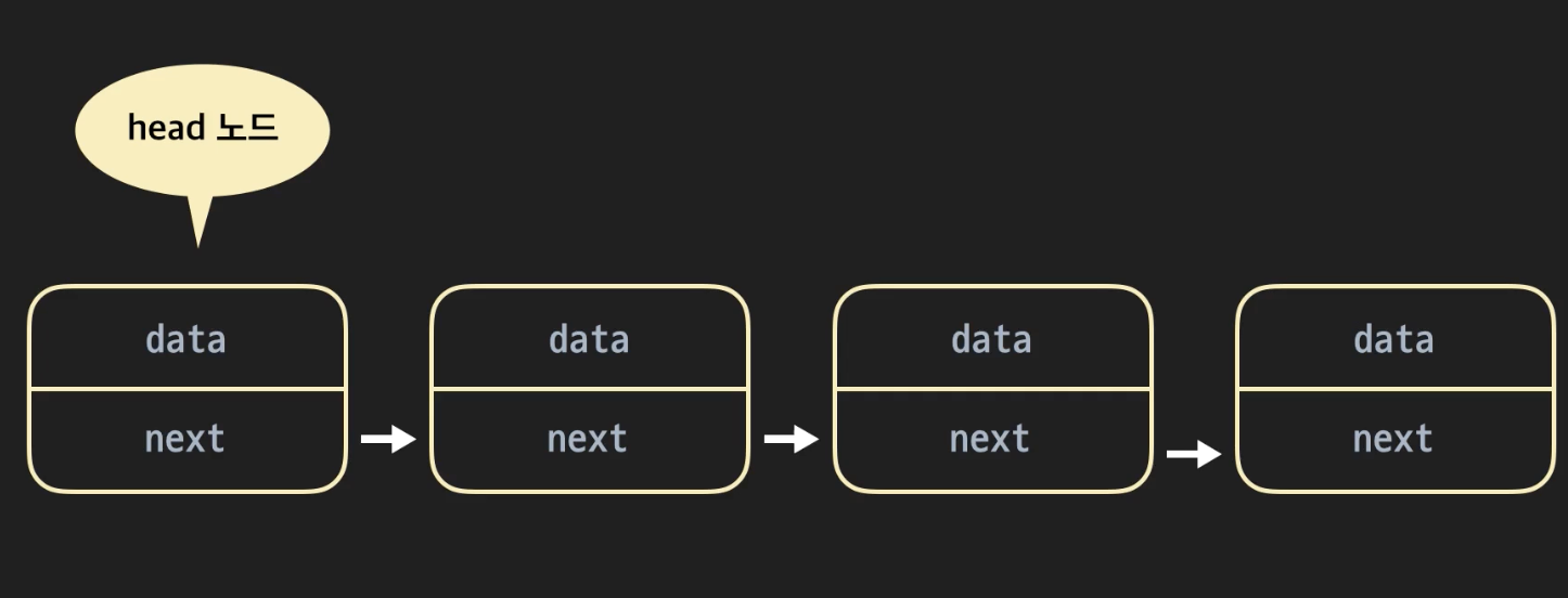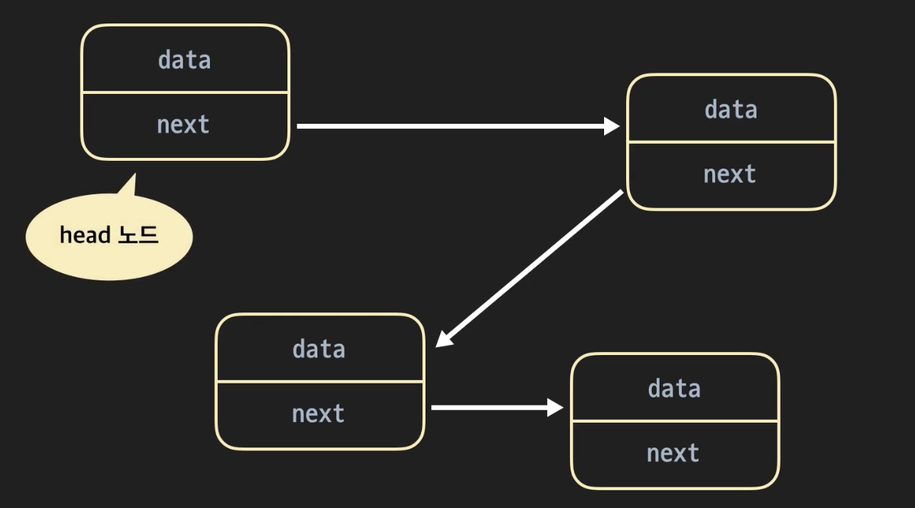 - 가장 첫 번째 노드 객체의 메모리 주소만 알고있으면 next를 타고타고가서, 연결되어있는 모든 노드에 접근할 수 있음