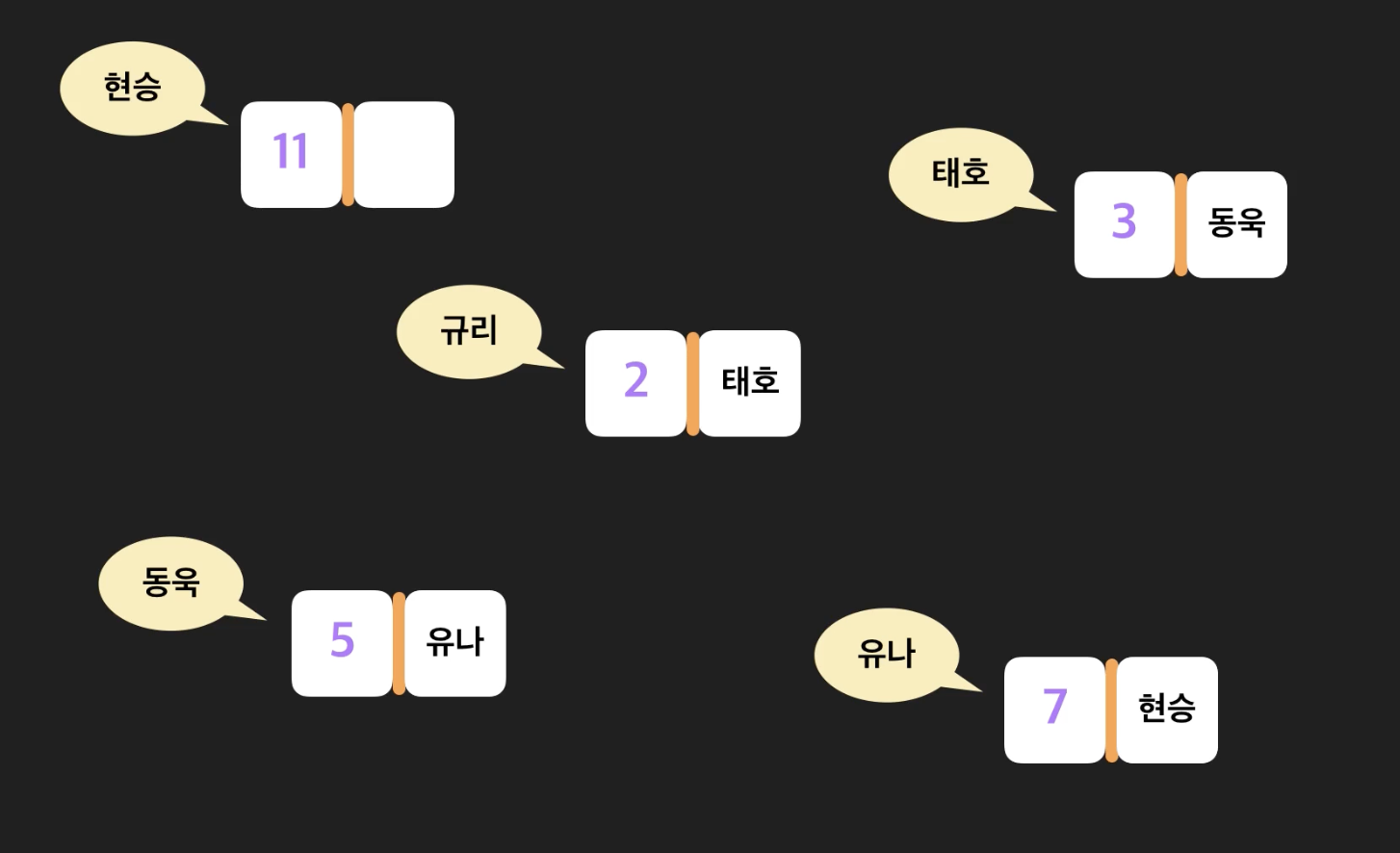 - 연결된 박스들의 순서 : 규리 → 태호 → 동욱 → 유나 → 현승