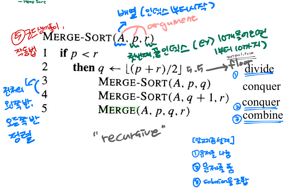 - ⌊(p + r) / 2⌋ : 배열을 반으로 나누기 위해 사용 (floor 연산 : 소수점 아래 버림)