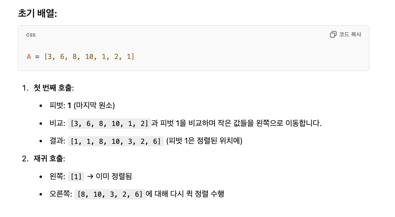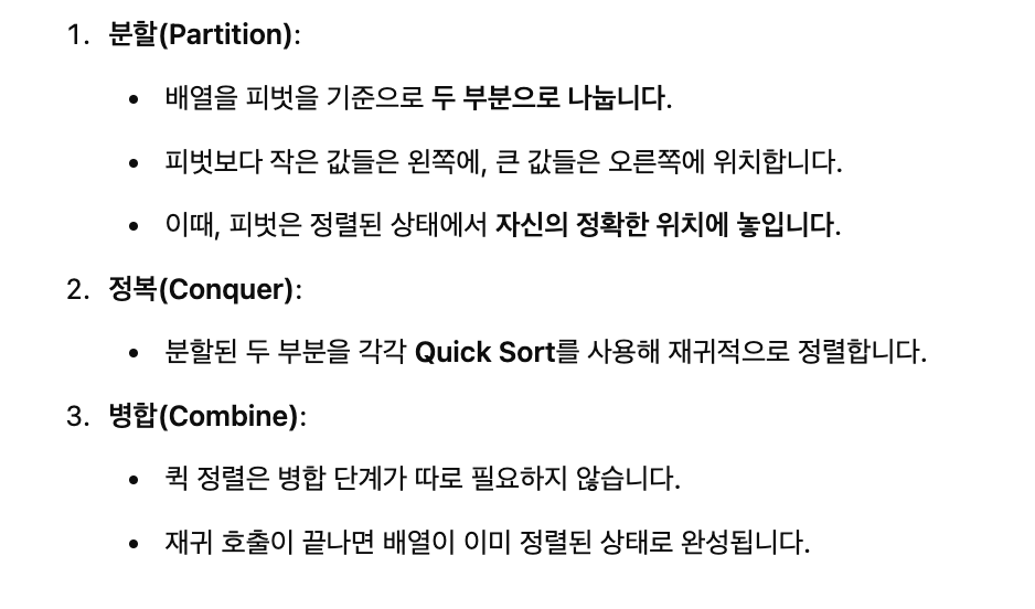 - Partition 단계: 배열을 두 부분으로 나눔. 기준값(피벗, pivot)을 기준으로, 작은 값들은 왼쪽으로, 큰 값들은 오른쪽으로 이동 - 재귀 호출 단계: 나누어진 두 부분에 대해 다시 QuickSort를 호출하여 정렬을 완성