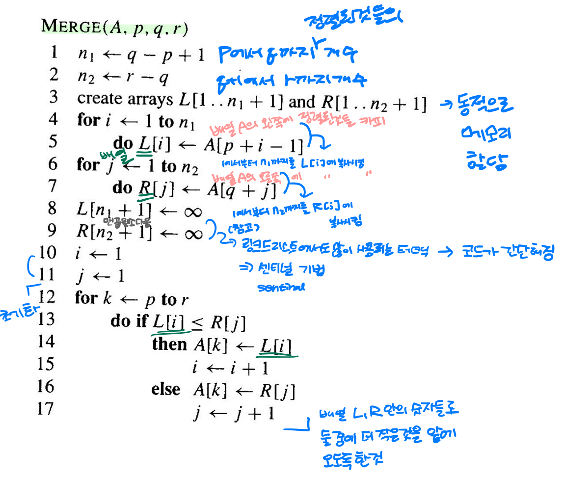 MERGE(A, p, q, r) : 두 개의 정렬된 배열을 받아서 하나의 배열로 정렬시키면서 합침