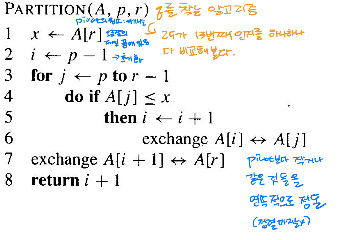 7 exchange A[i + 1] ↔ A[r] # (7) 피벗을 올바른 위치로 이동