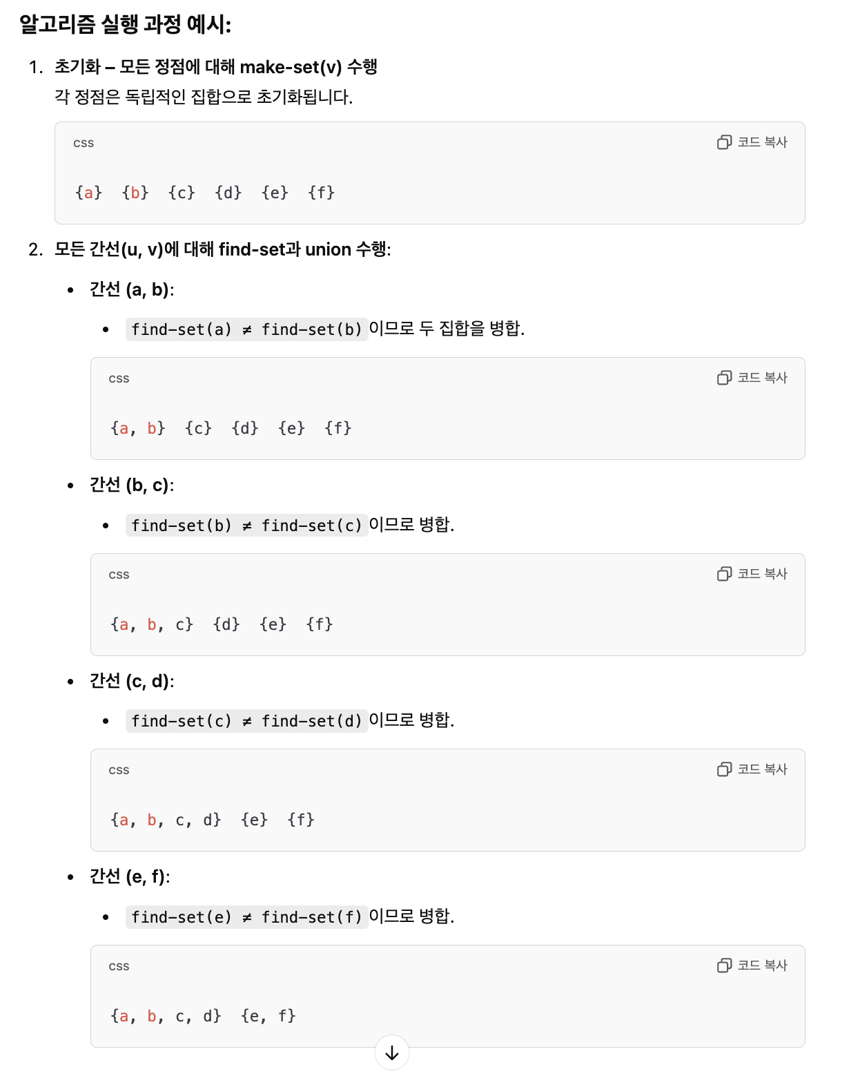 - 그래프의 각 노드에 대해 find-set과 union 연산을 반복하여 서로 연결된 노드들을 동일한 집합으로 병합합니다.