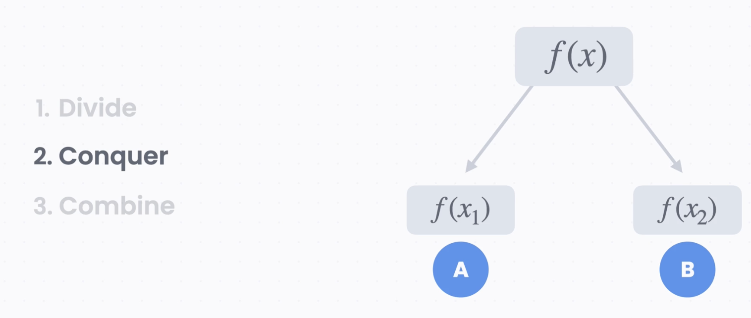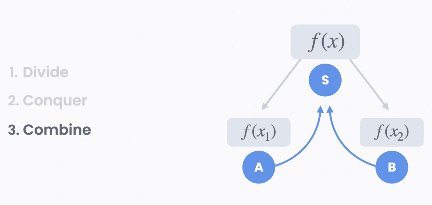 - 부분 문제를 각각 정복해서 솔루션 두 개가 나왔는데, 마지막으로 Combine 단계에서는 그 두 솔루션 A와 B를 이용해서 기존 문제를 해결하는 f(x)를 계산하면 됨