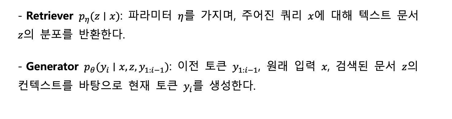 RAG 모델은 retriever와 generator를 결합해 입력 x로부터 관련 문서 를 검색하고, 이를 바탕으로 출력 를 생성하는 구조다.