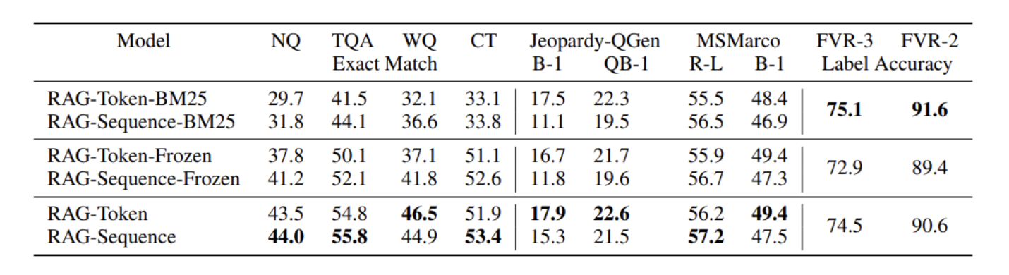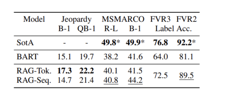 아래는 Jeopardy Quesion Generation, MS-MARCO (Abstractive QA), FEVER (사실 검증)에 대한 테스트 점수를 비교한 표이다.