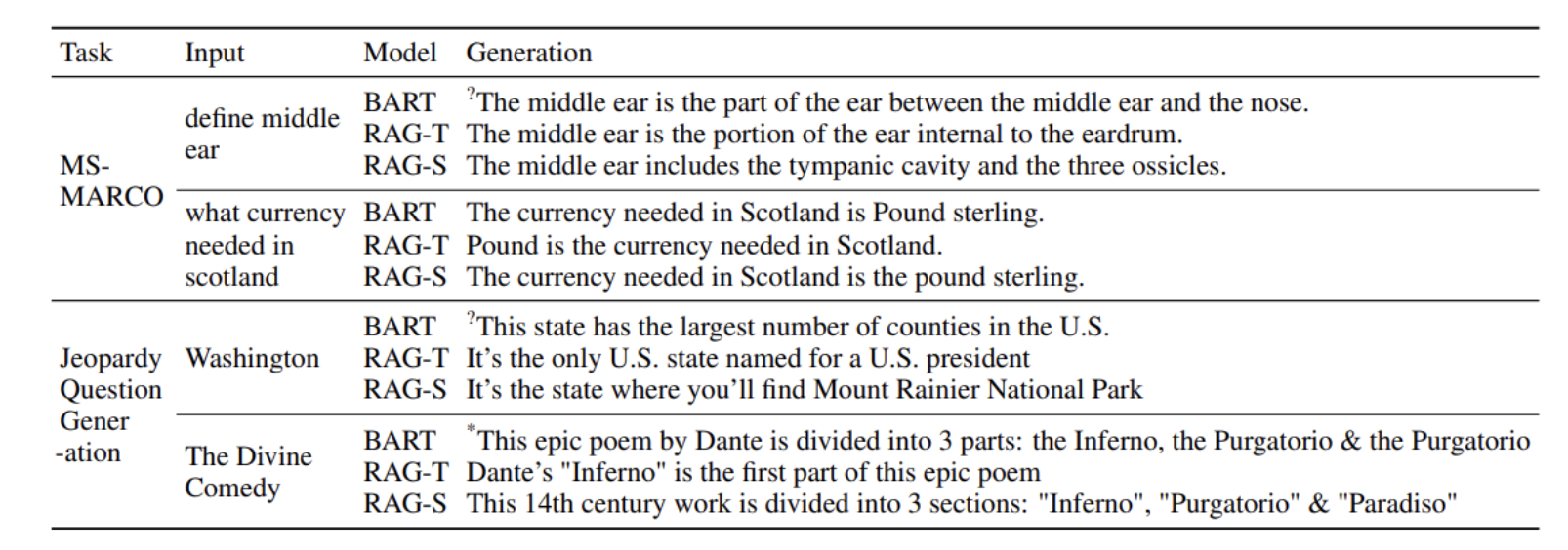 Jeopardy 질문은 종종 두 개 이상의 독립적인 정보를 포함하는데, RAG-Token은 여러 문서의 내용을 조합해 응답을 생성할 수 있기 때문에 이러한 경우에 가장 우수한 성능을 보인다.