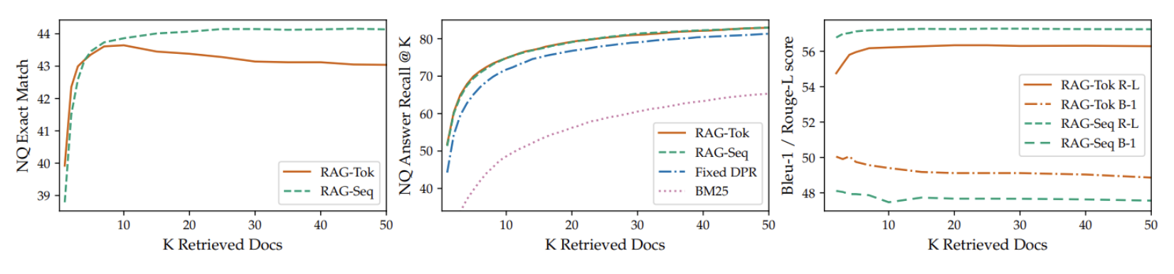 아래는 검색된 문서 수에 따른 Natural Questions (NQ) 성능을 비교한 그래프이다.