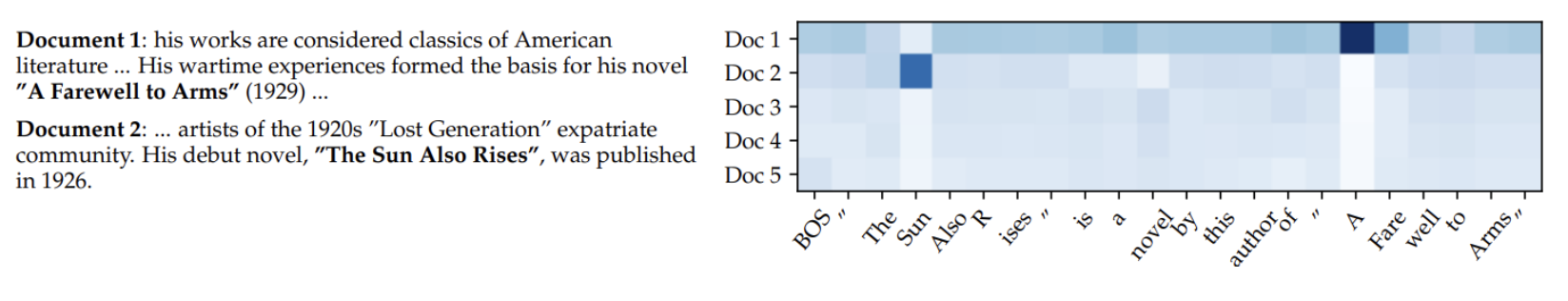아래 그림은 입력 “Hemingway”에 대해 5개의 검색된 문서를 기반이며, 아래와 같이 각 생성 토큰에 대한 RAG-Token posterior p(zi| x, yi, y-i)를 시각화한 결과를 보여준다.