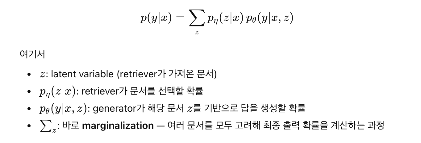 Retriever와 Generator는 end-to-end 방식으로 공동 학습되며, 검색된 문서 z를 latent variable로 취급한다.